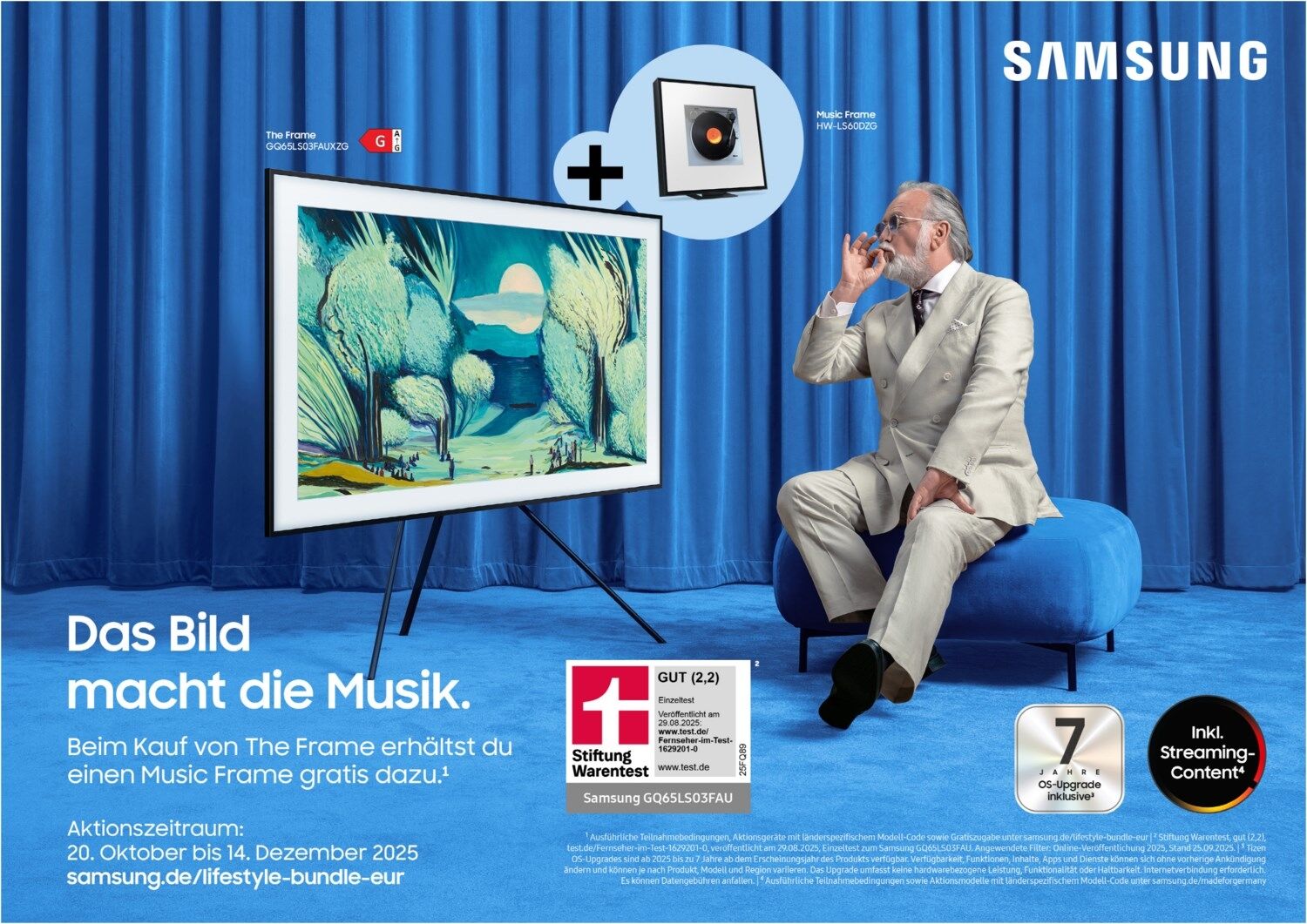 - ¹ Beim Kauf von The Frame erhältst du einen Music Frame gratis dazu. Aktionszeitraum: 20.10.2025 bis 14.12.2025 samsung.de/lifestyle-bundle-eur