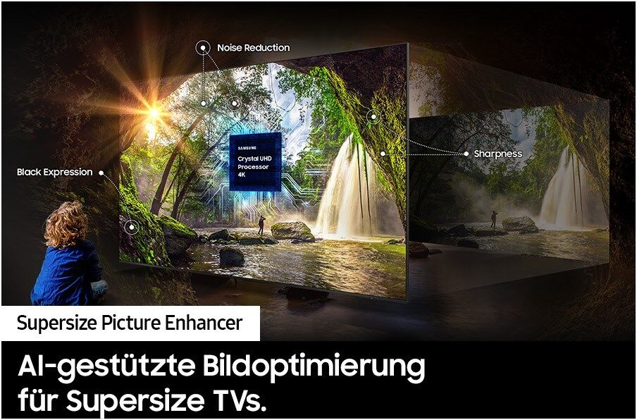 Um das bestmögliche Bild auf Supersize TVs zu gewährleisten, kombiniert die Technologie AIgestütztes Upscaling mit Rauschunterdrückung, Schärfeoptimierung und intelligenten Methoden zur Verbesserung des Schwarzwerts.
