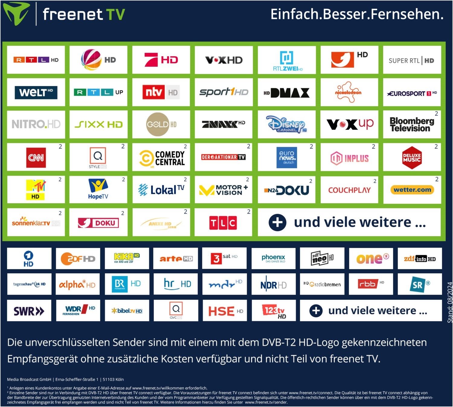 ³ Einzelne Sender sind nur in Verbindung mit DVB-T2 HD über das freenet TV connect Angebot verfügbar. Die Voraussetzungen für freenet TV connect finden sich unter www.freenet.tv/connect. Die Qualität ist bei freenet TV connect abhängig von der Bandbreite der zur Übertragung genutzten Internetverbindung des Kunden und der vom Programmanbieter zur Verfügung gestellten Signalqualität. Die öffentlich-rechtlichen Sender können über ein mit dem DVB-T2 HD gekennzeichnetem Empfangsgerät frei empfangen werden und sind nicht Teil von freenet TV. Weitere Informationen zu den genauen Sendern entnehmen Sie unter www.freenet.tv/programme.