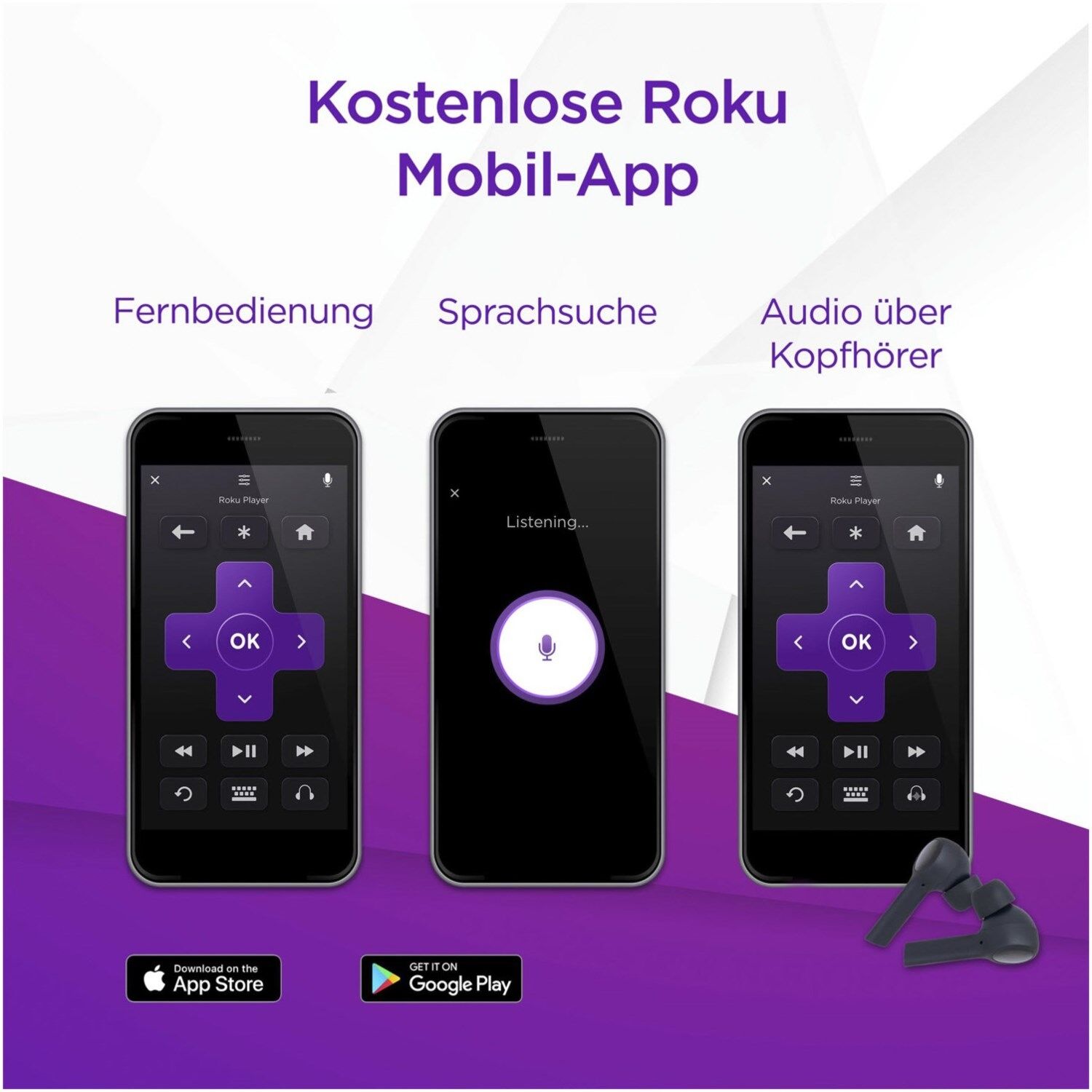 - Kostenlose Roku App: Steuere deinen TV, nutze die Sprachsuche, Audio über Kopfhörer und mehr. iOS® und Android™